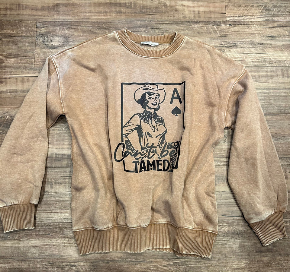 Saddle brown “Can’t be tamed”acid wash crewneck