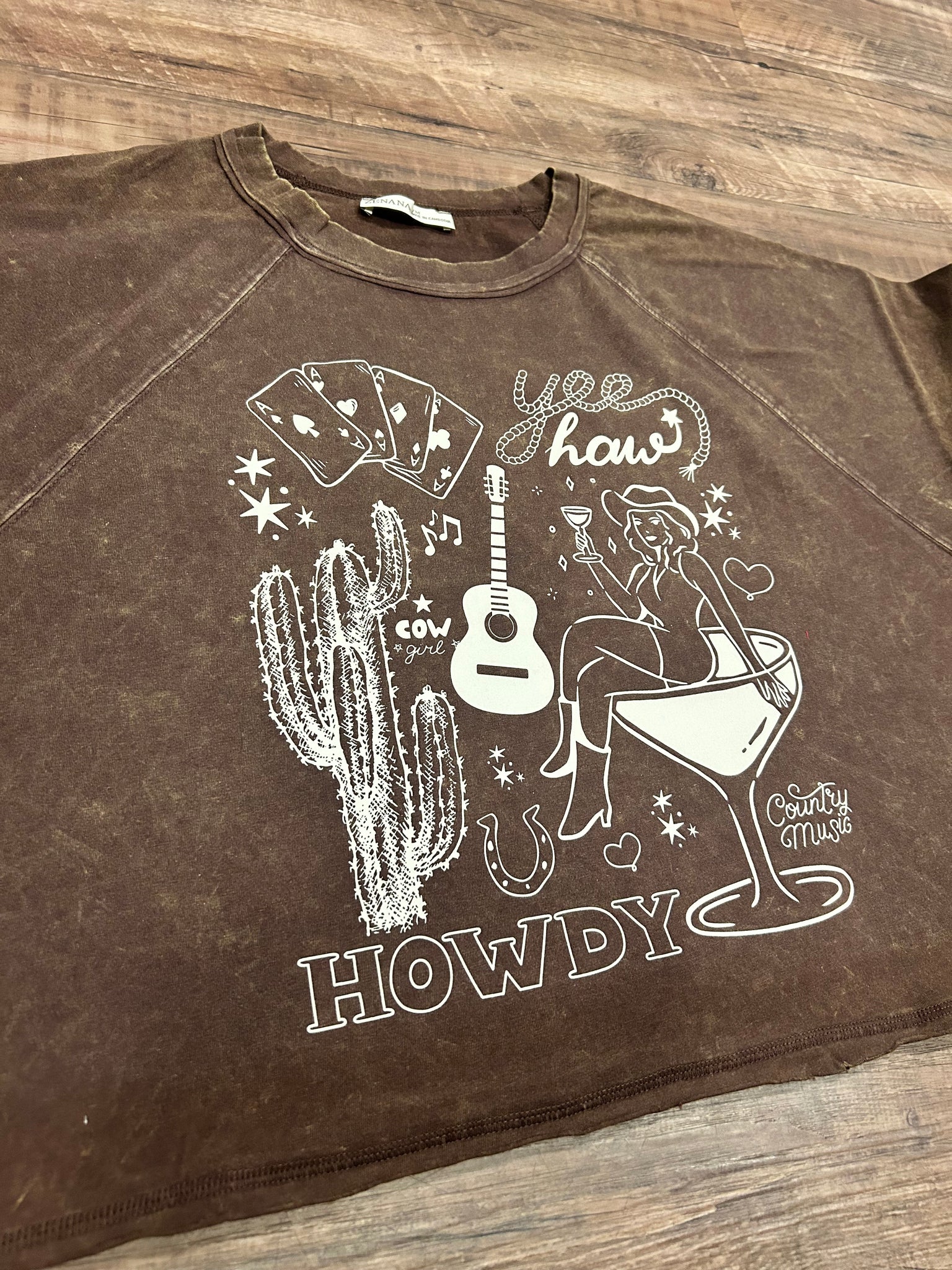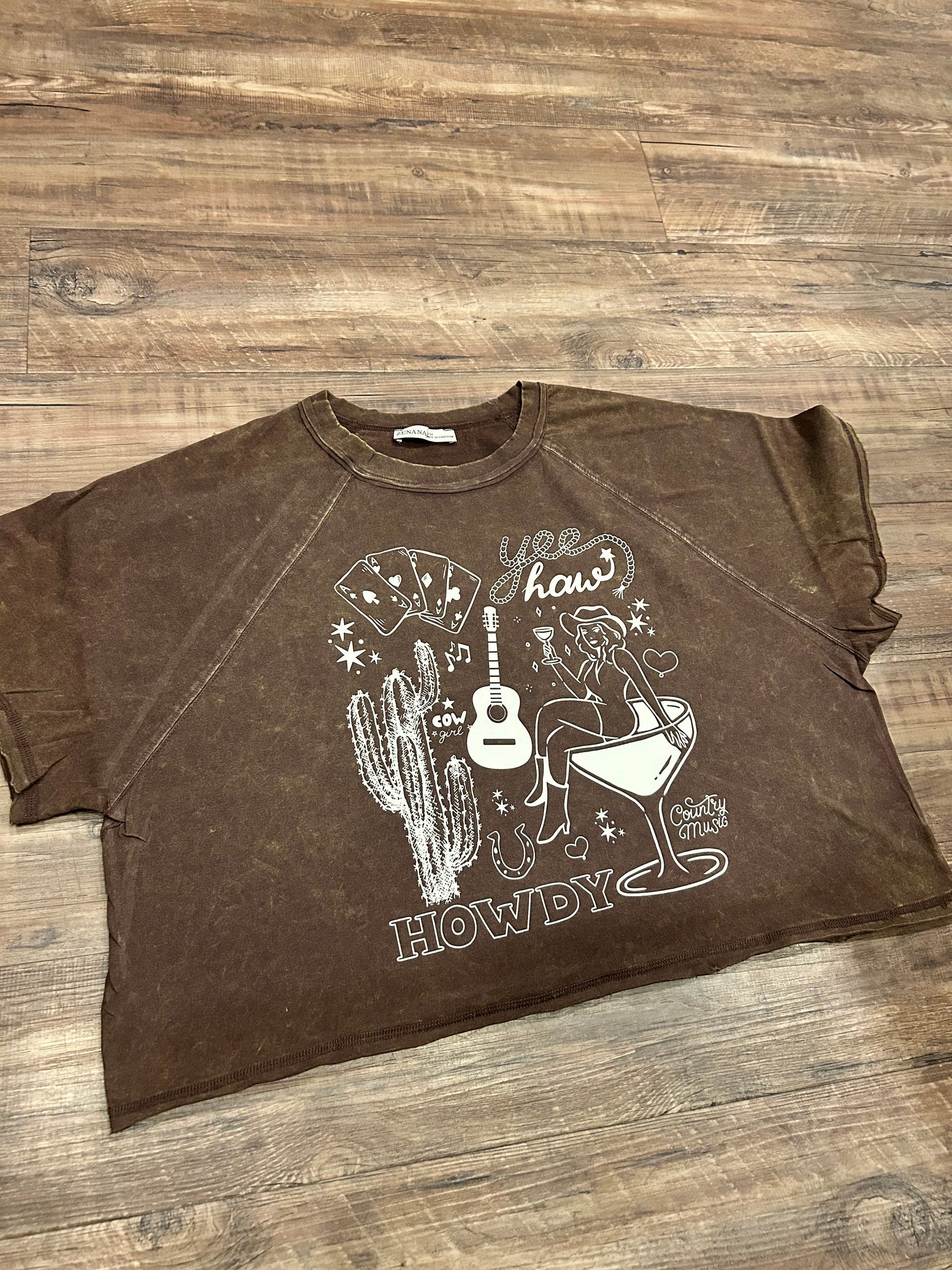 Chocolate brown acid wash pin up martini cowgirl collage western t-shirt