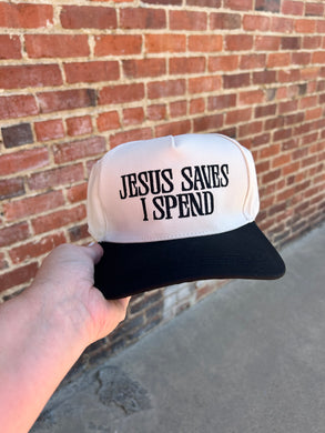 Ivory & Black Jesus Saves I Spend embroidered hat