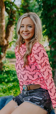 Teal with brown bucking horse & cactus mesh long sleeve top