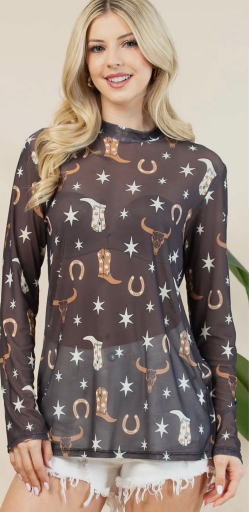 Black with saddle brown & cream steer head, boots & horseshoes western long sleeve mesh top
