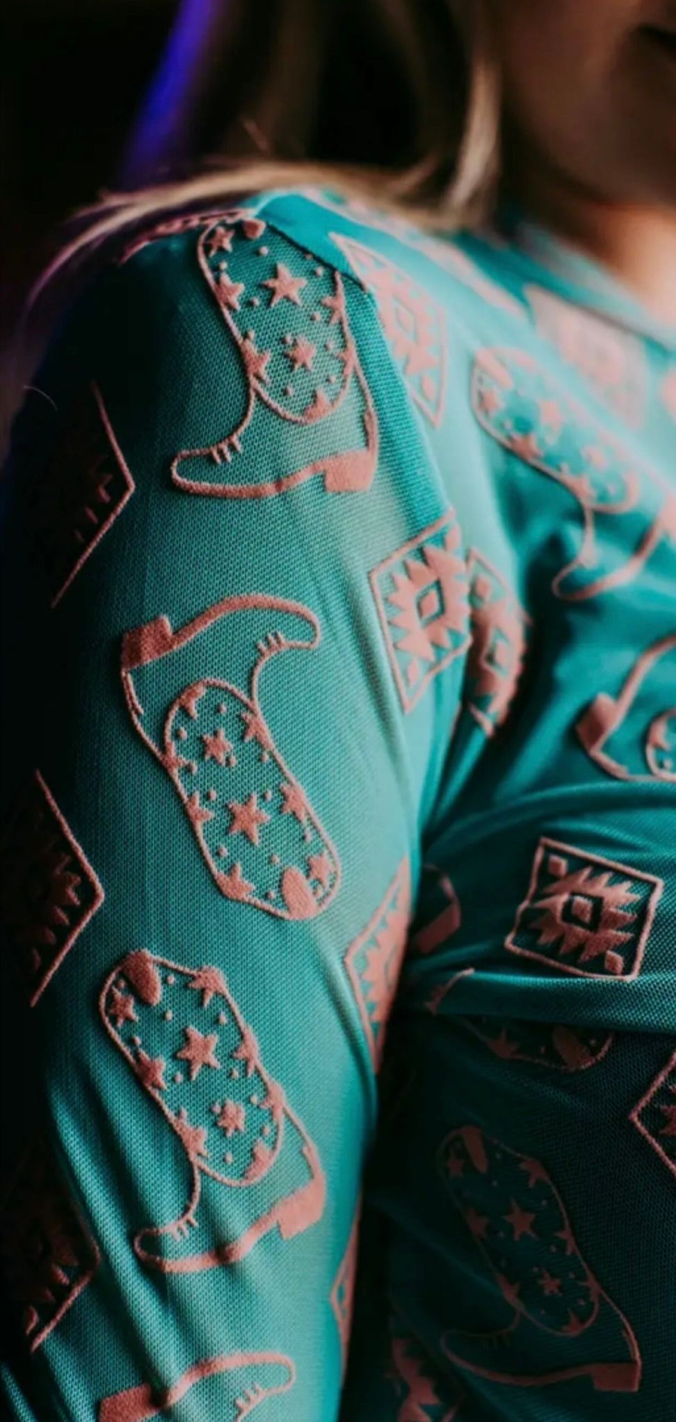 Teal with pink velvet overlay boot & Aztec mesh western long sleeve top