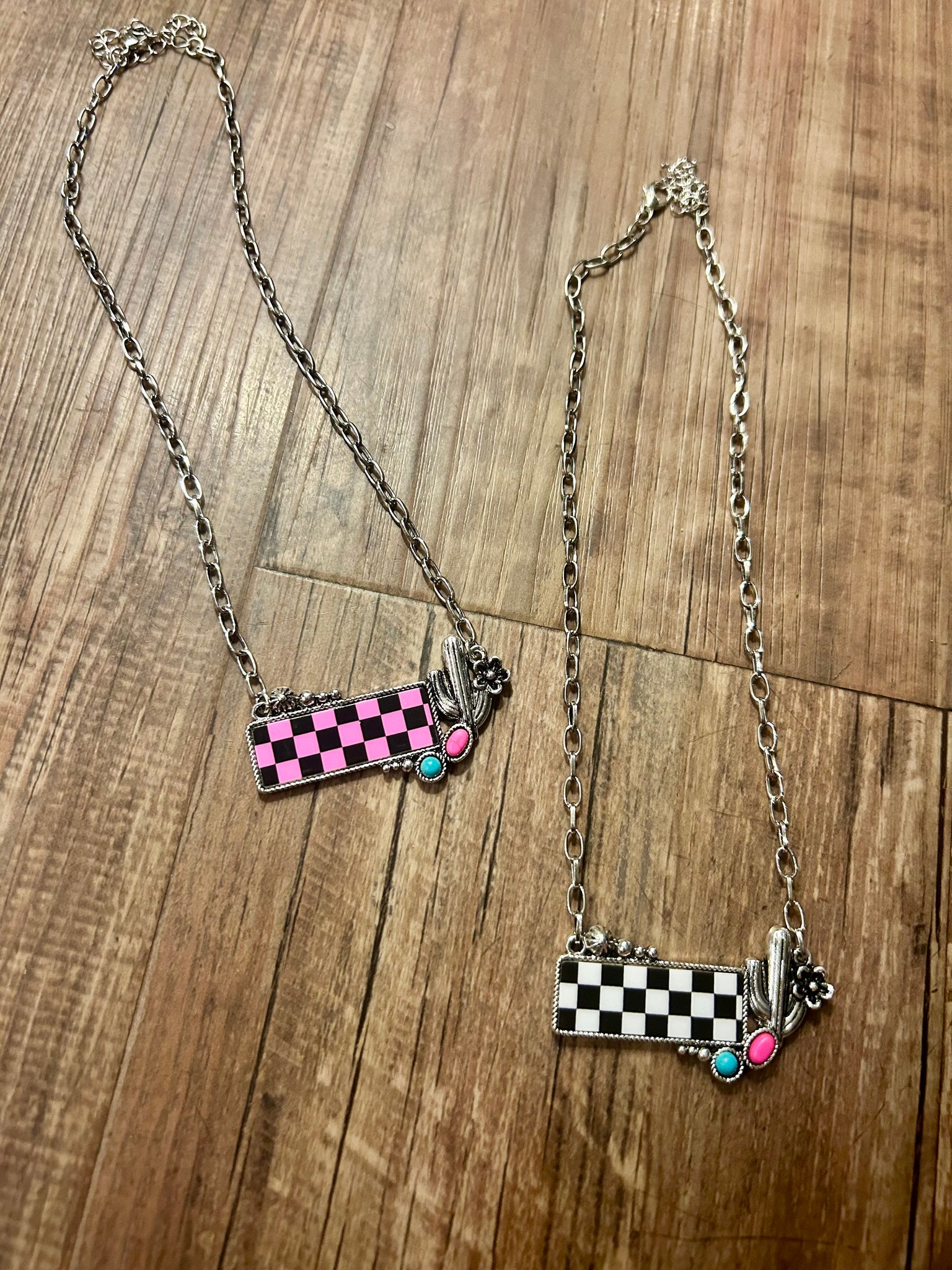 Western checkered bar with synthetic stones in either Black & White checkered or Pink & Black Checkered! Both have an adjustable chain and are perfect for layering or to wear on alone