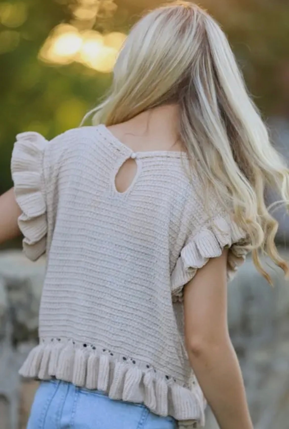 Cream knit short sleeve ruffle edge sweater top
