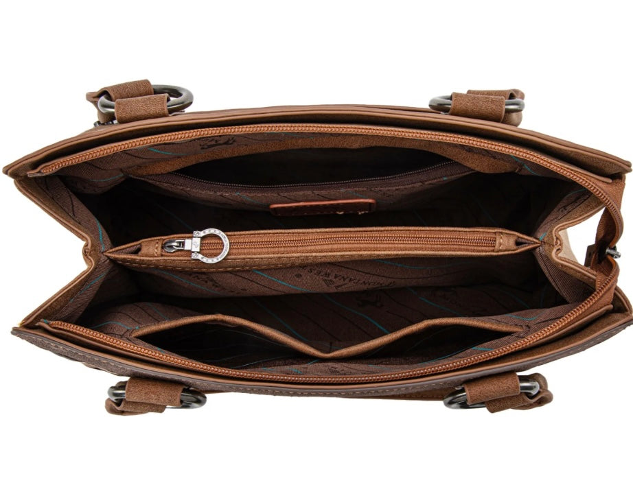 Made of PU leather (suede-feel), this concealed carry tote bag has:
