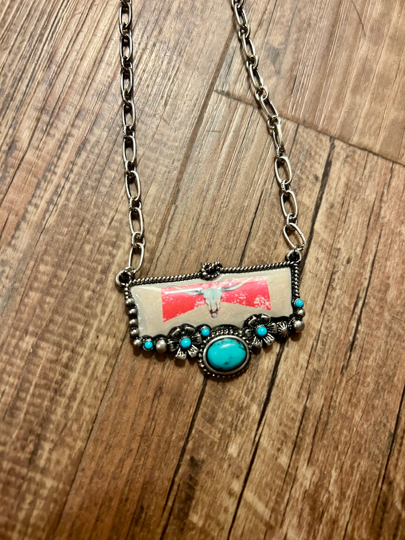 Taupe & red vintage longhorn necklace with synthetic turquoise stone accent perfect to layer with Navajo beads or some turquoise
